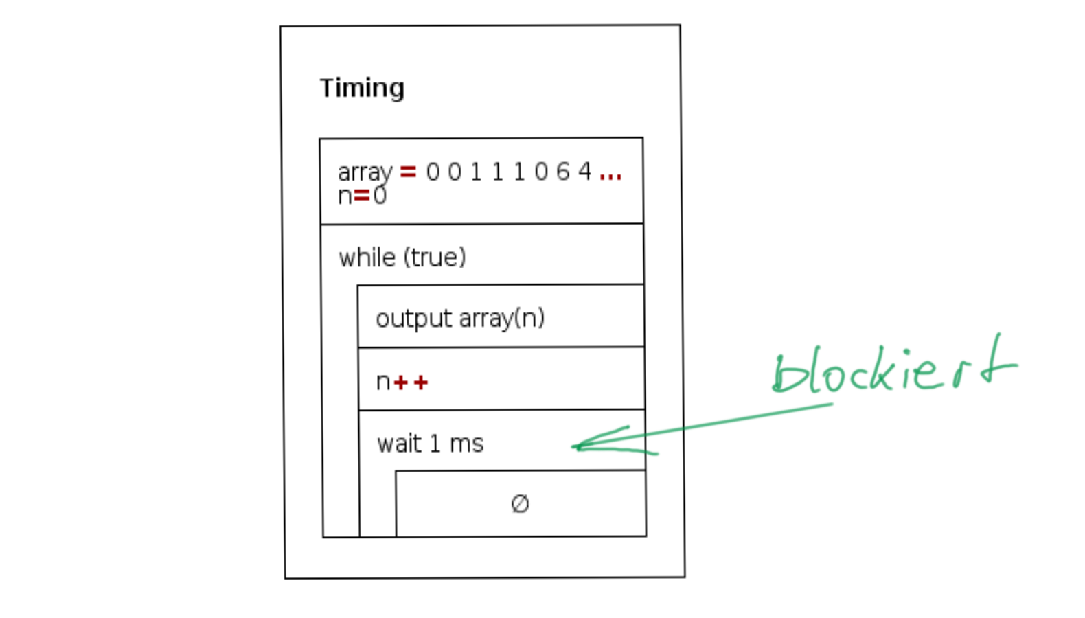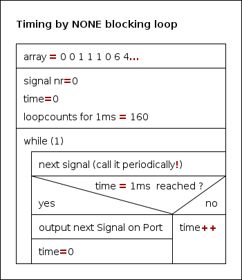 Hier blockiert die Schleife nicht, dafür ist die Struktur komplexer. Eine Variable time zählt die Schleifendurchläufe und liefert so die Zeitbasis.