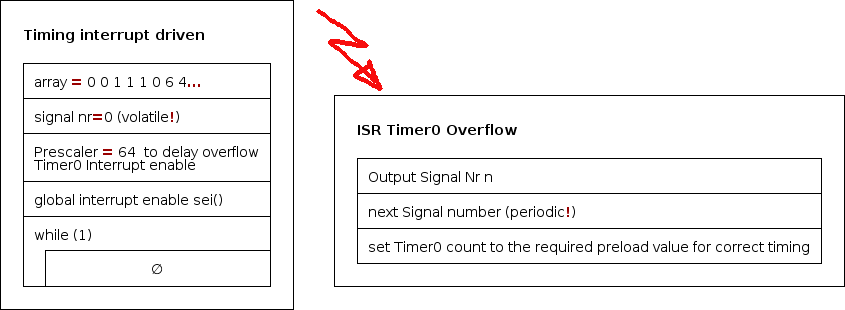 Ein Timer wird so eingestellt, dass seine Überläufe den Takt vorgeben; man kann den Timer auf einen bestimmten Wert setzen (preload), dann läuft er schneller über. Nach einem Overflow wird in der Interrupt Service Routine (ISR) mitgezählt wie oft der Überlauf passiert ist und immer wieder der richtige Preload-Wert gesetzt. -