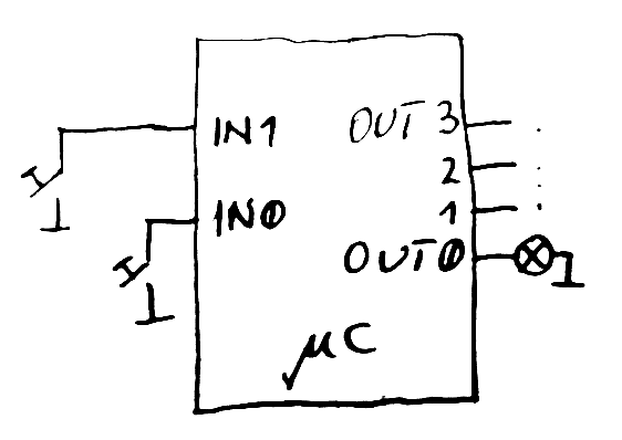 e.g.: both buttons pressed = pattern 00 => 0001 as output