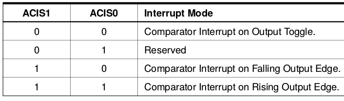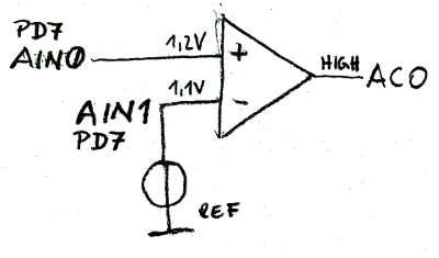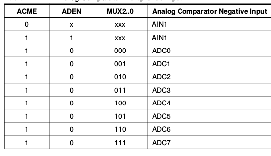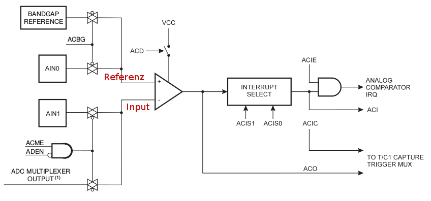 negativer Input wahlweise von Pin AIN1 oder von ADC Eingängen (beim ATMEG 328 sind nur die Eingänge ADC0..7); dies ist aber nur möglich, wenn der ADC (AD-Umsetzer) nicht verwendet wird (ADEN=0) -