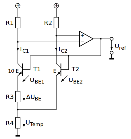 bei geringer Stromdichte ist die Abnahme geringer d.h. die Spannung am PN-Übergang steigt im Vergleich zu einer Vergleichsdiode (PTAT proportional to absolute temperature)