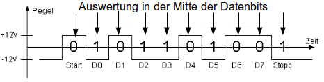 Jedes übertragene Wort muss somit von einem Startbit (logischer Wert 0) eingeleitet und mit mindestens einem Stopp-Bit (logischer Wert 1) abgeschlossen werden.
