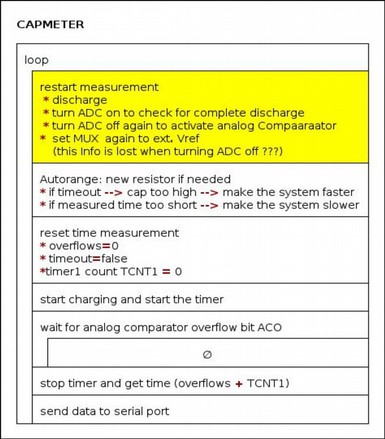 * Main.cpp * * incomplete – open zip file attached */ #include <Arduino.h> #define TIMER_START TCCR1B = (1<<CS10) #define TIMER_STOP TCCR1B = 0 #define ANALOG_COMP_INT_DISABLE ACSR &= ~(1 << ACIE); #define INPUT_HIGHER_THAN_REFERENCE (ACSR & (1<<ACO)) #define THRESHOLD 5 //D10 ADC13 #define CHARGE 5 //Arduino Pin numbers #define CHARGELONG 6 #define SENSE 4 #define DISCHARGE 3 #define TESTPIN 2 //just for debugging - with LED volatile int timeroverflows = 0; volatile bool timeout = false; int speed = 1; //fastest unsigned long timePhase1; unsigned int senseVoltage; void sendSerial(); //output data to serial port void dischargeC(); //discharge the cap void restart(); //start new conversion void chargeC(uint8_t speed1){ pinMode(DISCHARGE,INPUT); pinMode(SENSE,INPUT); if (speed1==3){ pinMode(CHARGE,INPUT); pinMode(CHARGELONG,OUTPUT); digitalWrite(CHARGELONG,HIGH); } else if (speed1==2){ pinMode(CHARGELONG,INPUT); pinMode(CHARGE,OUTPUT); digitalWrite(CHARGE,HIGH); } else{ pinMode(CHARGELONG,INPUT); pinMode(CHARGE,INPUT); pinMode(DISCHARGE,OUTPUT); //fastest pin: discharge digitalWrite(DISCHARGE,HIGH); speed=1; } } uint16_t threshold; uint16_t resistorHigh; uint16_t resistorLow; void setup() { pinMode(TESTPIN,OUTPUT); Serial.begin(115200UL); getThresholdAndResistorinfo(); // Analog Multiplexer: Enabled high bit for Mux 8..15 ADCSRB = (1 << ACME)|(1<<MUX5); ADCSRA &= ~(1<<ADEN);//ADEN disabled for Analog Mux to work ADMUX = THRESHOLD; // 5 ... ADC13 //ACSR &= ~((1<<ACD)|(1<<ACBG)); // Disable digital input (preserves power consumption) DIDR1 |= (1<<AIN0D); TCCR1A = 0; TCCR1B = 0; TIMSK1 = (1<<TOIE1); TIMER_STOP; speed = 1; } uint16_t nr =0; #define TIMEOUT 1500 void loop() { restart(); TCNT1=0; if (timeout){ speed--; //shorten time constant digitalWrite(TESTPIN,HIGH); } if (timePhase1<100){ speed++; digitalWrite(TESTPIN,HIGH); } timeroverflows=0; timeout=false; chargeC(speed); digitalWrite(TESTPIN,LOW); TIMER_START; while((!INPUT_HIGHER_THAN_REFERENCE) &&(!timeout)); //wait for ACO TIMER_STOP; timePhase1=timeroverflows*0x10000+TCNT1; if (!timeout) sendSerial(); else { Serial.print("Timeout:"); Serial.println(speed); } } ISR(TIMER1_OVF_vect){ timeroverflows++; if (timeroverflows>TIMEOUT) timeout=true; } void dischargeC(){ pinMode(DISCHARGE,OUTPUT); digitalWrite(DISCHARGE,LOW); pinMode(SENSE,OUTPUT); digitalWrite(SENSE,LOW); pinMode(CHARGE,OUTPUT); digitalWrite(CHARGE,LOW); pinMode(CHARGELONG,OUTPUT); digitalWrite(CHARGELONG,LOW); } void restart(){ dischargeC(); ADCSRA |= (1<<ADEN); //turn ADC on senseVoltage = 100; while (senseVoltage > 0) //wait for cap to discharge { delay(1); senseVoltage = analogRead(A6); } ADCSRA &= ~(1<<ADEN); //turn ADC off so Analog Mux can work ADMUX = THRESHOLD; delay(50); }