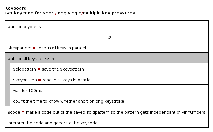 //short Keystrokes = Keycode 1,2,3 //long Keystrokes = 11, 12, 13 //very long Keystrokes = 101, 102, 103 uint8_t waitForKey() { int keyTime = 0; TRACE ("waitForKey") int newSensorValue = 0; DELAY (20); //let the adc recreate while (sensorValue == 0) { sensorValue = analogRead (analogInPin); DELAY (50) //debounce } //delay(50); //let the adc settle sensorValue = analogRead (analogInPin); DELAY (300); newSensorValue = analogRead (analogInPin); while ( (newSensorValue / 100 == sensorValue / 100) && (sensorValue != 0) ) { // div by 100 to reduce sensibility DELAY (300) keyTime++; newSensorValue = analogRead (analogInPin); if (keyTime >= 2){ Radio.mute(); //feedback to user for long key pressure delay(50); Radio.unMute(); } if (keyTime > 6){ Radio.mute(); //feedback to user for very long key pressure delay(500); Radio.unMute(); } } int keyValue = map (sensorValue, 0, 1023, 0, 5); if (keyTime >= 2 && keyTime <= 6) { keyValue += 10; } else if (keyTime > 6) { keyValue += 100; } sensorValue = 0; return keyValue; }