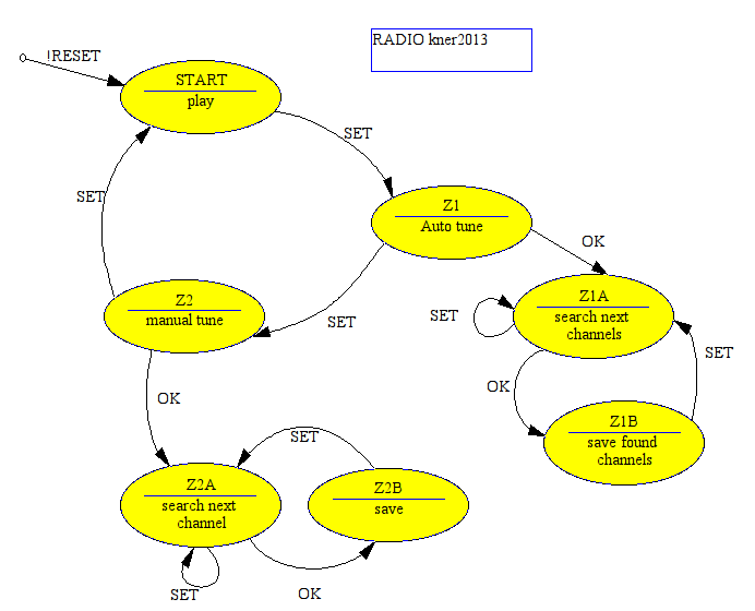 zwei Tasten (SET und OK) steuern das Radio; ein Mehrfachtastendruck (RESET) springt von jedem Zustand zu START