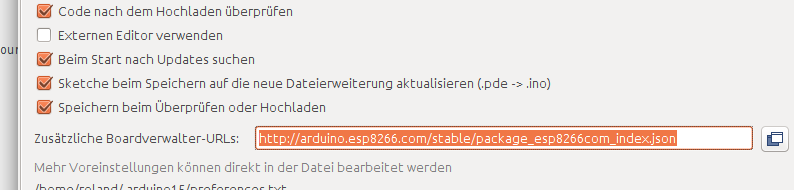 Menüpunkt {Datei/Voreinstellungen} und Boardmanager-URL eingebenhttp://arduino.esp8266.com/stable/package_esp8266com_index.json