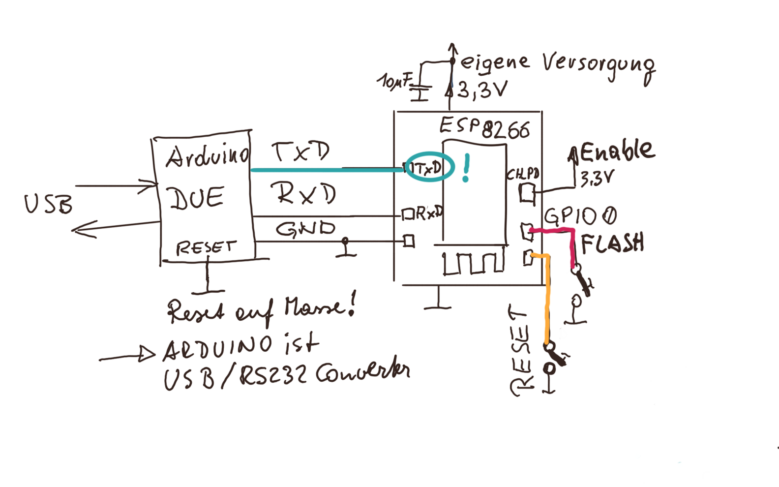ESP8266: eigene Versorgung!!!!; kurzer Reset-Puls auf Masse setzt den Baustein zurück; nötig nach jedem Modus-Wechsel; Flash-Mode: GPIO0 auf GND.