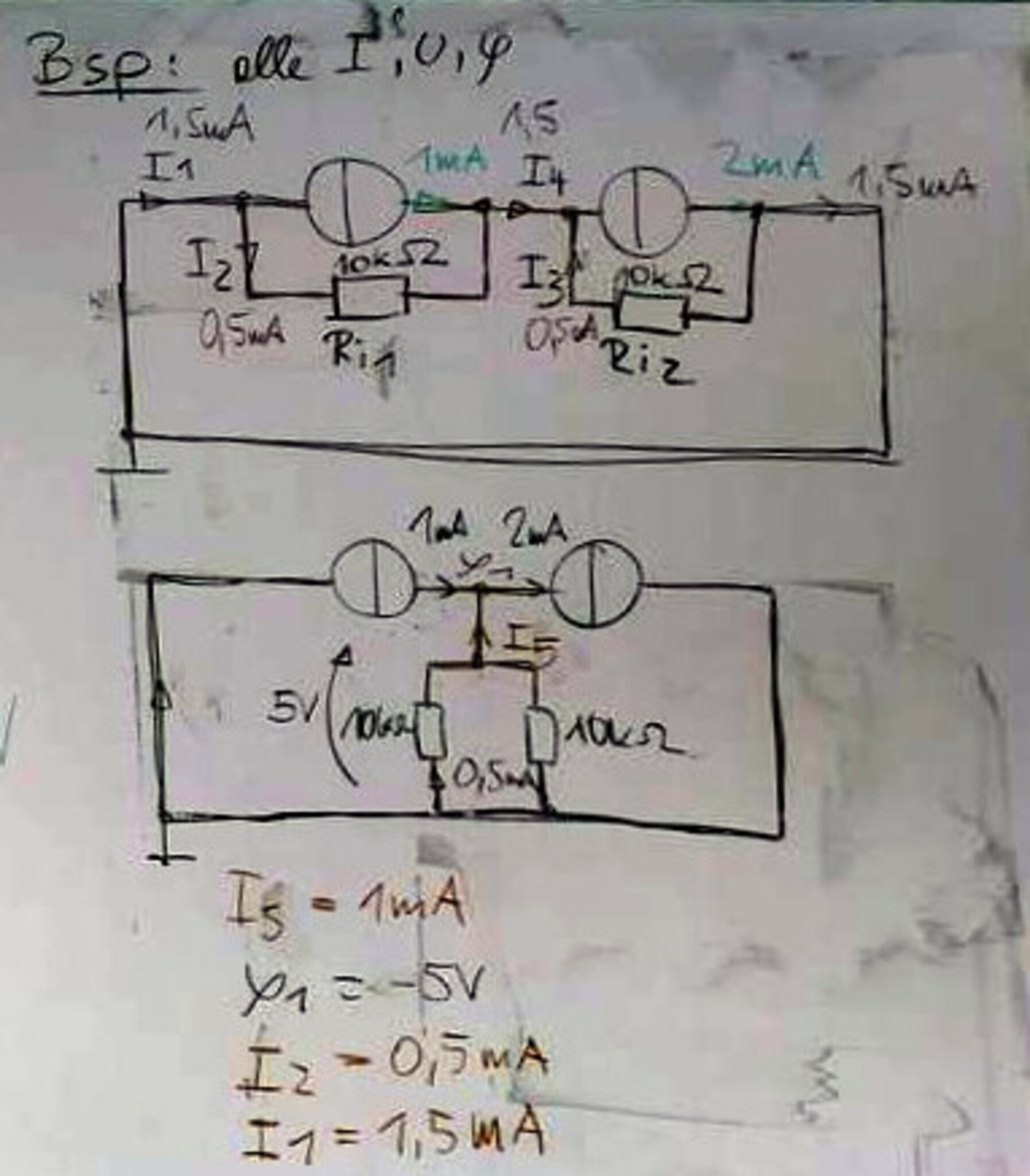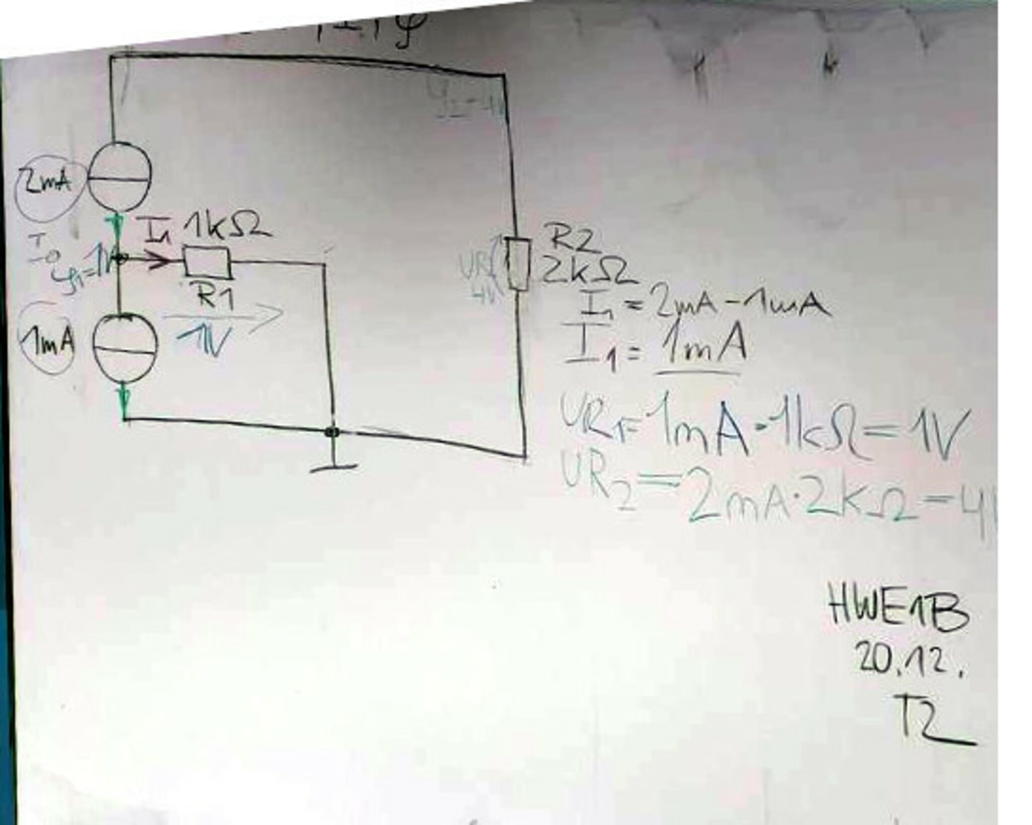 tafelbild.2022-01-08_12-00-34.jpgDo, 03. Mär 2022 13:05:08 Zwei reale Stromquellen in Serie: durch Umzeichnen der Originalschaltung erkennt man, dass die beiden Widerstände parallel liegen. I4 = 1.5mA