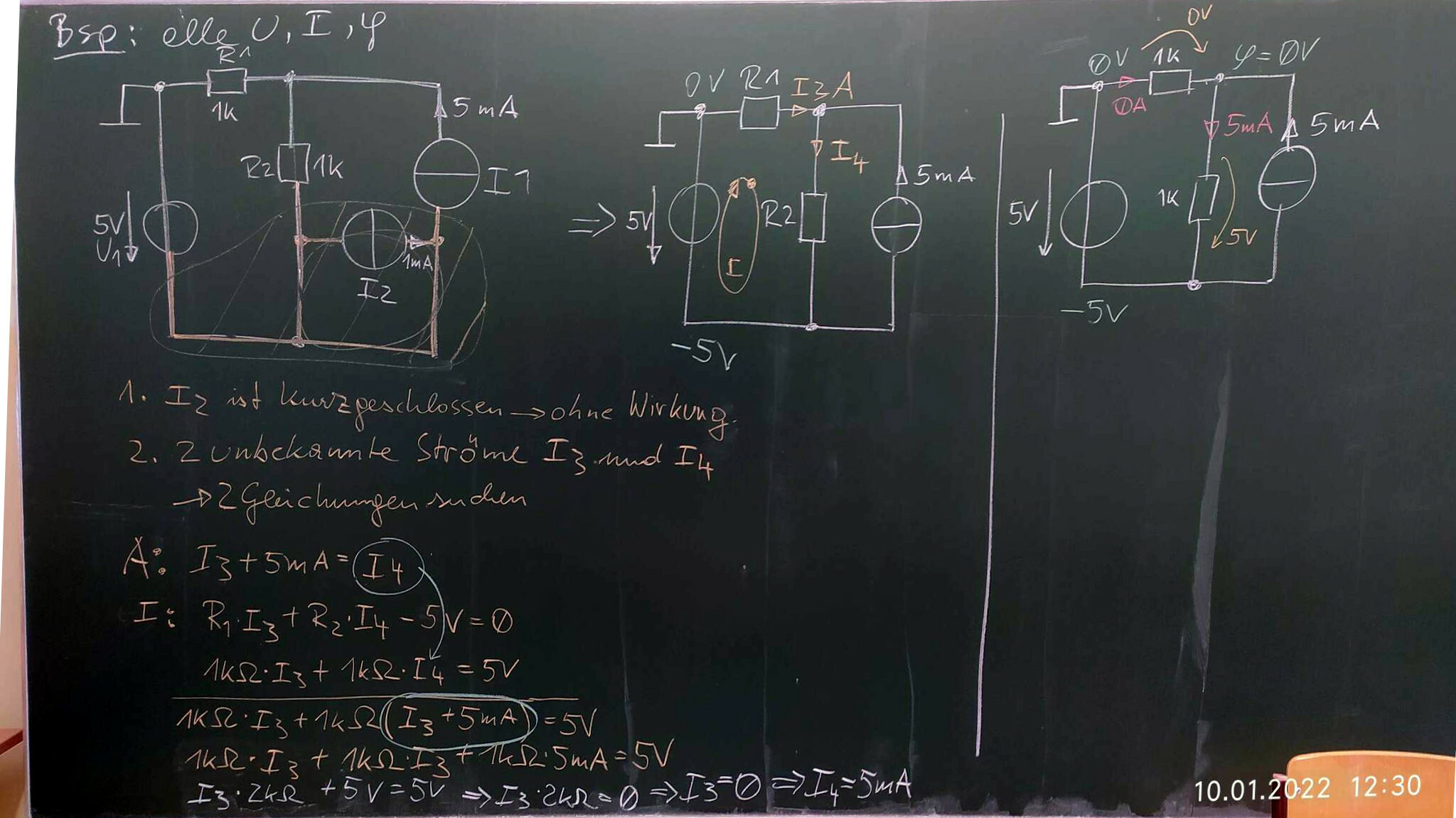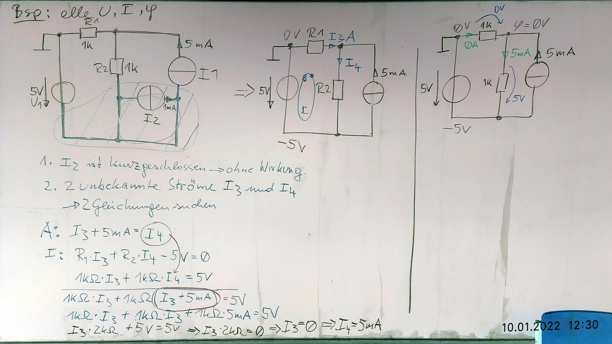 tafelbild.2022-01-10_13-11-20.jpgDo, 03. Mär 2022 13:05:08 Mehrere Quellen Lösung durch schrittweises Bestimmen der Ströme, Spannungen und Potenziale