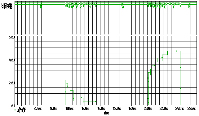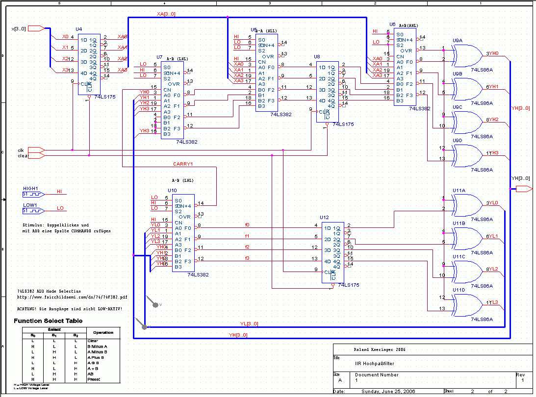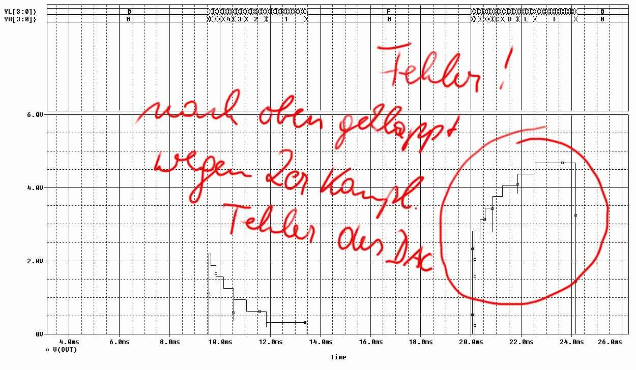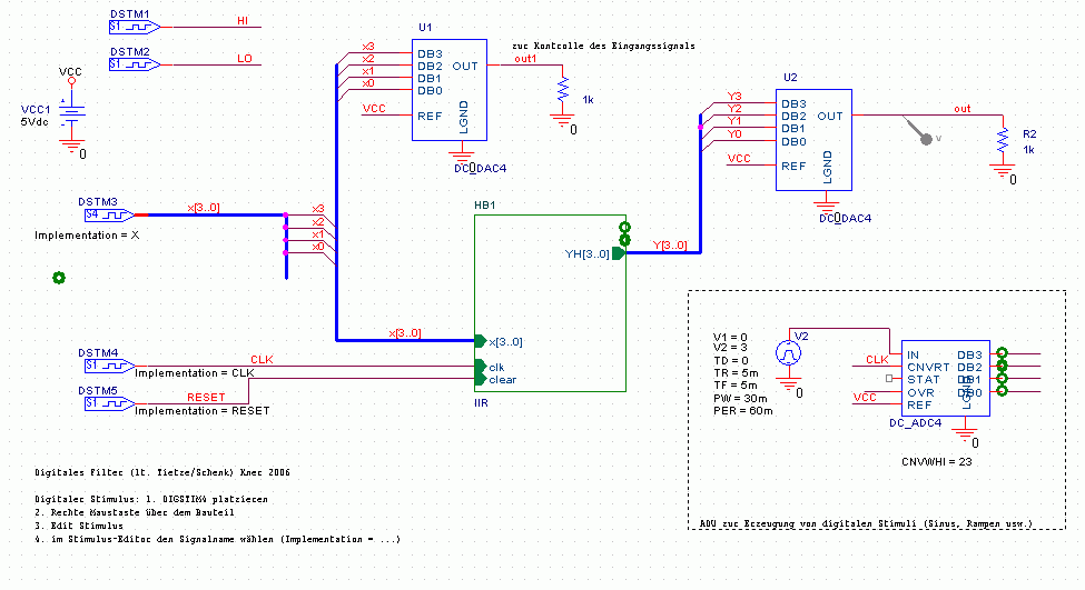 Das folgende Filter finden Sie in Tietze/Schenk. Die im Buch angeführte Schaltung wird in Orcad/PSPICE realisiert. Es handelt sich um ein 4Bit Filter mit intern 8Bit Wortbreite. Das Filter arbeitet mit negativen Zahlen in 2erKomplement-Darstellung. Der am Ausgang verwendete DAC kennt keine negativen Zahlen, die Filterantwort scheint daher in der Simulation falsch.