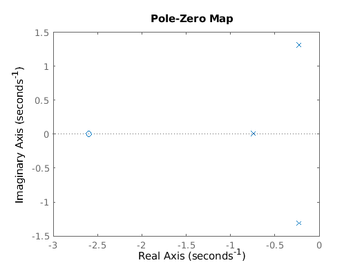 Will man nun die Sprungantwort simulieren, so kriegt man eine Fehlermeldung: d.h. die Laplace-Beschreibung der Strecke hat einen Pol bei s=0 (f=0Hz, also Gleichstrom). Um dies zu bereinigen muss der Pol etwas nach links in der s-Domäne verschoben werden. Laplace=(0.5*s+1.3)/((s+0.1)*(s^2+1.2*s+1.6)).