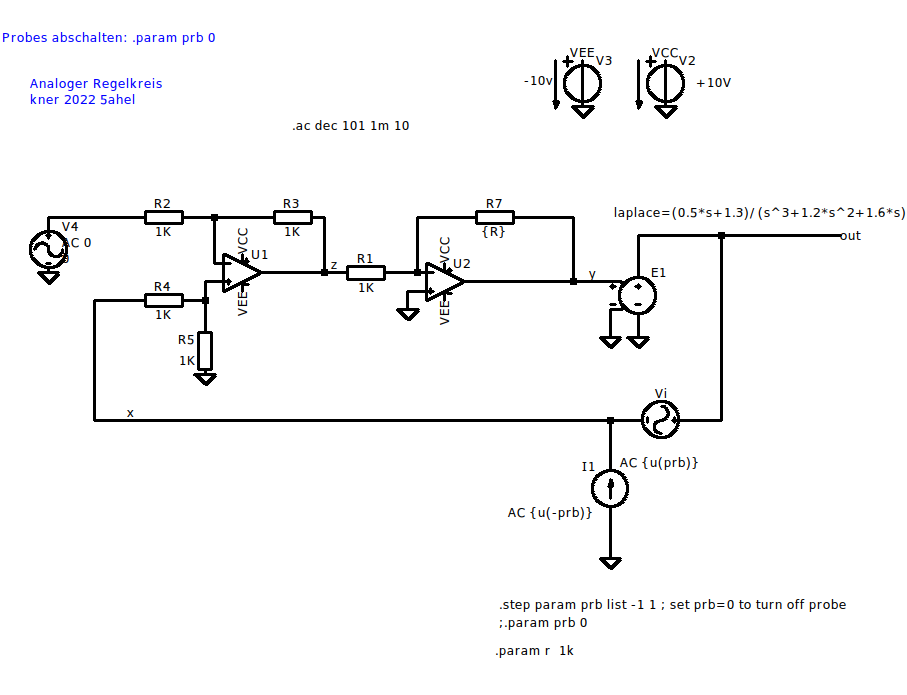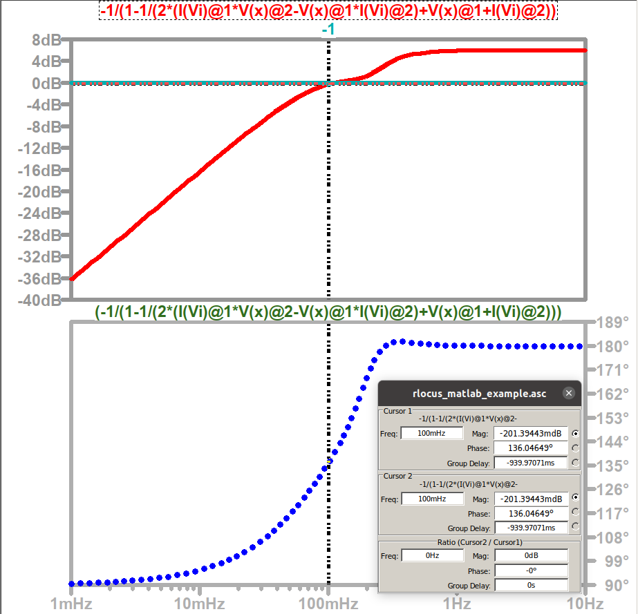 Um diese Beurteilung in LTSpice zu simulieren muss bei geschlossener Regelschleife auf die offene Schleife zurückgerechnet werden. Dies wird im LTSpice-Beispiel openloop2 erklärt (in LTSpice verfügbar).