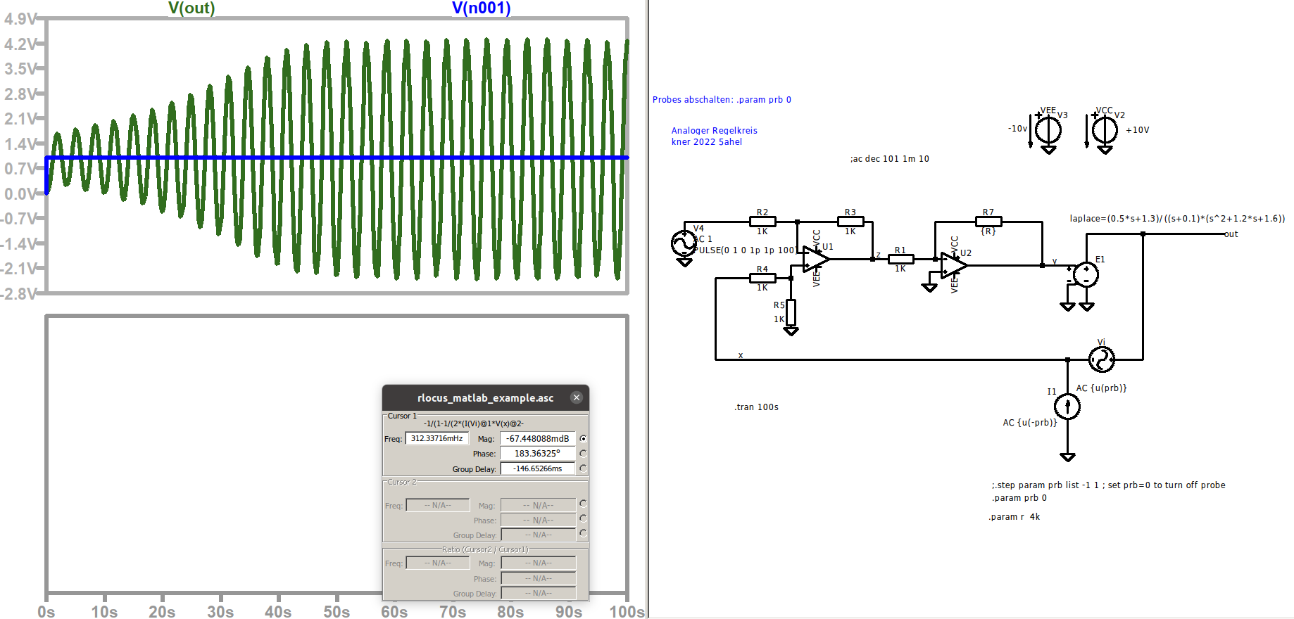 in dieser Simulation sieht man, dass bei k=1 der Schaltkreis stabil ist. ( Eigentlich ist hier k=-1, aber die Rückführung der Regelschleife wird beim + des Addierers eingespeist, daher muss k negativ sein).