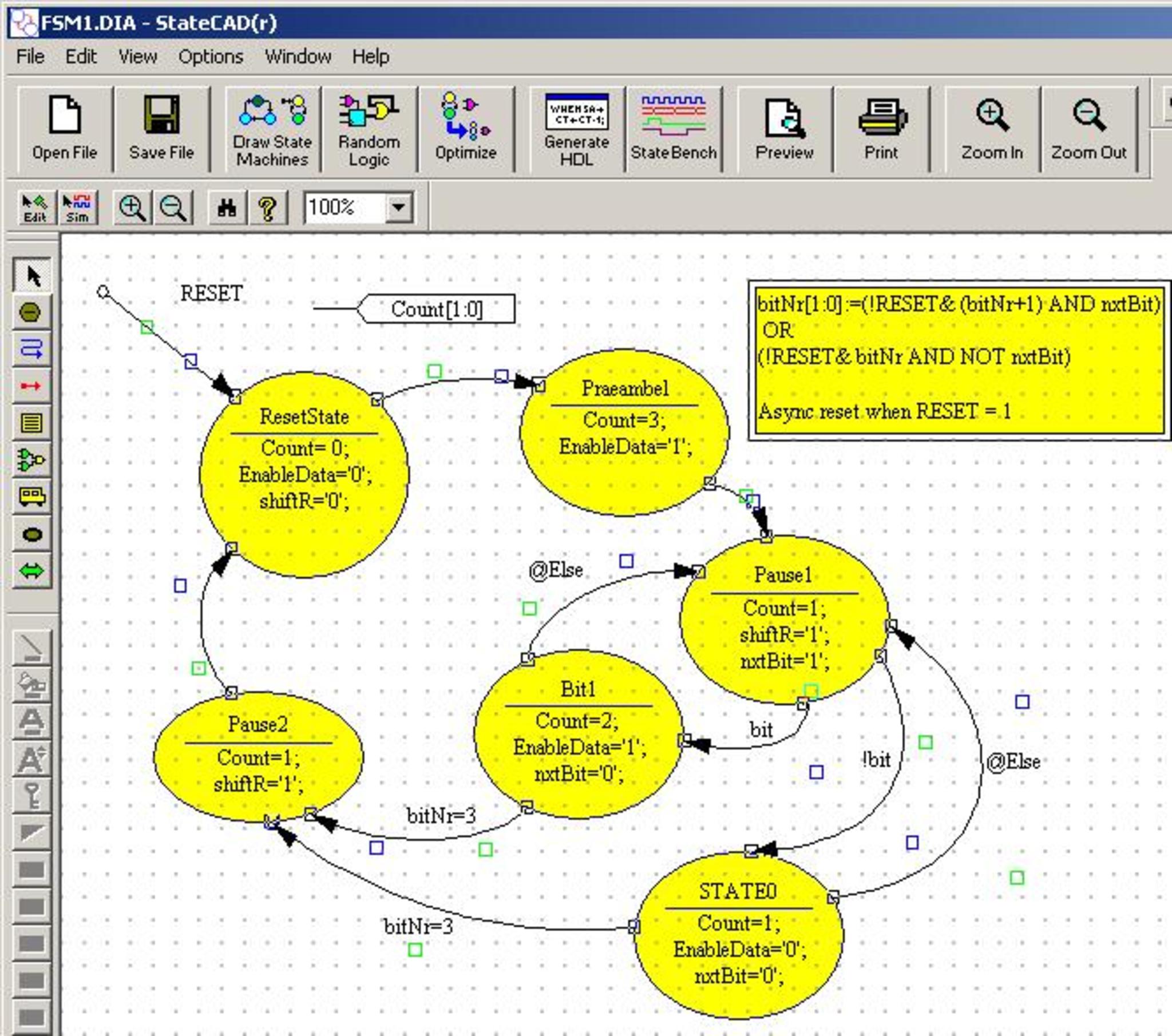 Die Datenbits werden vom Eingang bit geholt; getaktet wird die FSM durch den Mikrocontroller bzw. durch die zweite Statemachine, wenn diese die Bursts fertig ausgepulst hat.