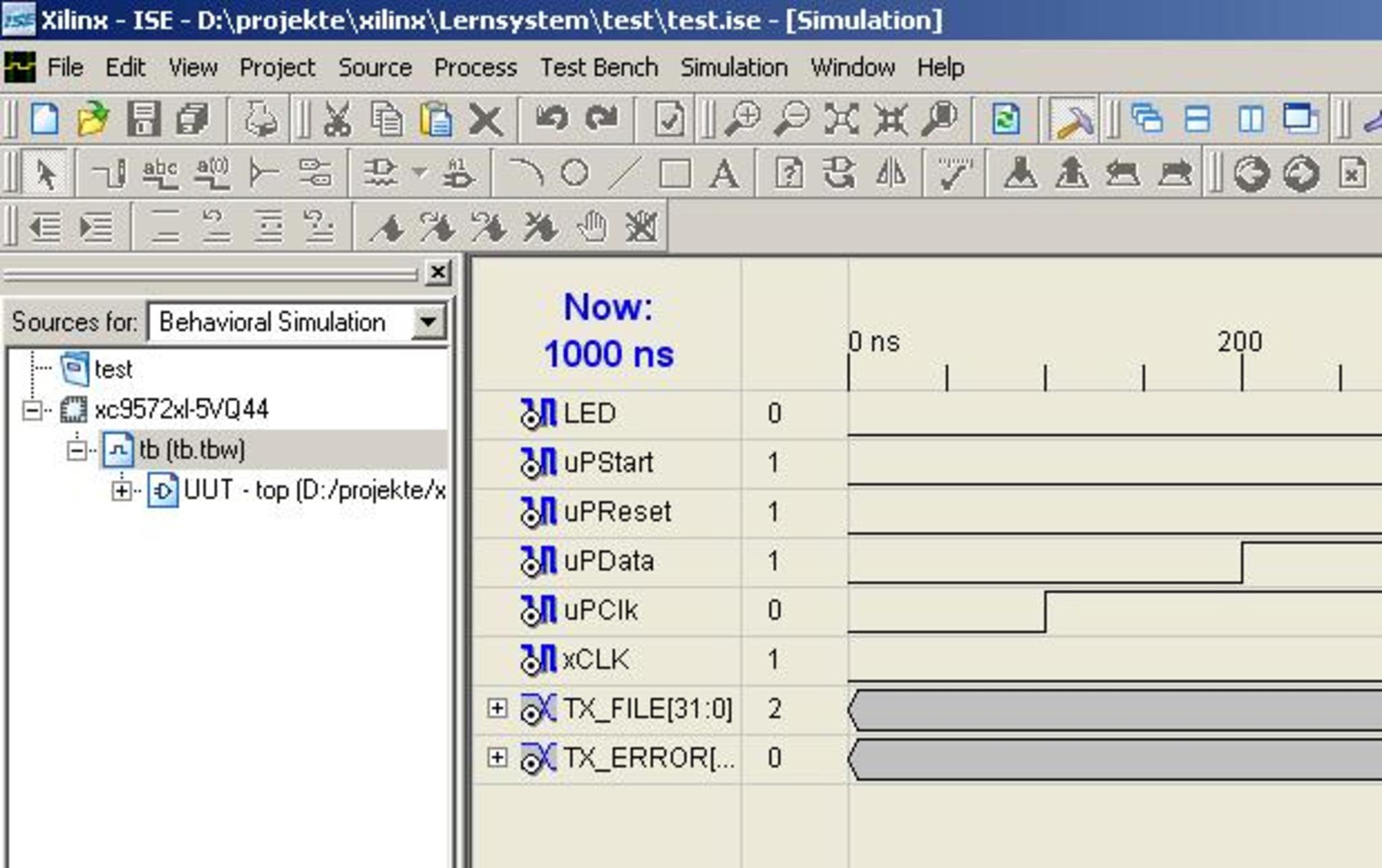 Simulation: es muß ein Testbench-File ins Projekt eingebunden werden und ISE auf Behavioral Simulation geschaltet werden.