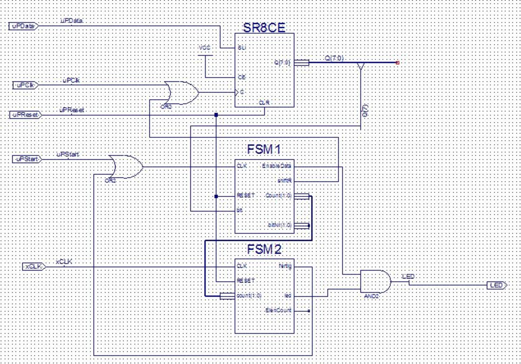 liefert 10, 20, 30 Bursts abhängig vom Eingang count; die Bursts werden auf eine Led ausgegeben, wenn nicht eine Pause ansteht (EnableData=0); das Signal „fertig“ schaltet die FSM1 um einen Zustand weiter