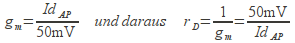 Das „Wechselspannungsauge“ sieht die Diode als Widerstand; die Höhe des Widerstandes ist abhängig vom Gleichstrom, der die Diode leitend macht (Id im Arbeitspunkt) und vom Wechselstromauge nicht gesehen werden kann. Der Betrag des Widerstands ist gegeben durch die Steigung der Tangente im Arbeitspunkt (Steilheit gm). Der differentielle Widerstand einer Diode rD ist der Kehrwert der Steilheit gm. Die Steilheit ist über weite Bereiche proportional zum Gleichstrom im Arbeitspunkt.