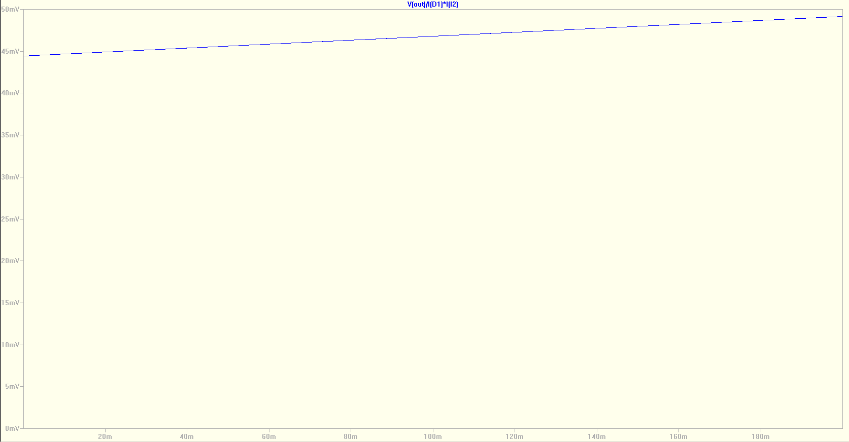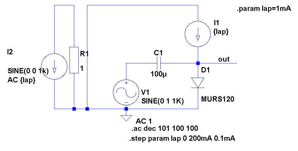 Simulationsschaltung: es wird eine AC-Simulation bei einer einzigen Frequenz durchgeführt; der Parameter Iap variiert den Gleichstrom im Arbeitspunkt; da dieser Strom in der AC-Analyse (Wechselstrom-Auge) nicht sichtbar ist wird ein gleich großer Wechselstom I2 erzeugt, der dann in der Berechnung von UT' verwendet werden kann UT'=rD*I2