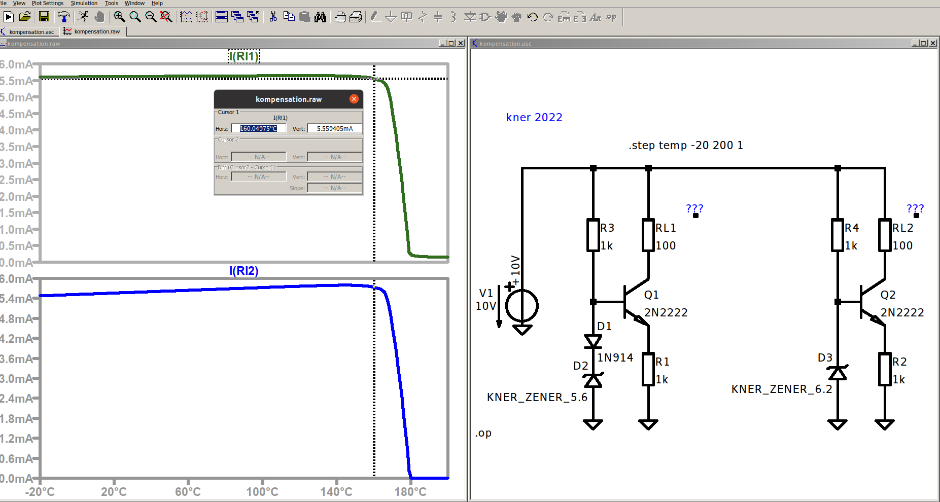 man sieht: der Strom bleibt im Bereich -20° bis +160° relativ stabil, da der Abfall der Basis-Emitter-Spannung des Bipolartransistors durch den gleich hohen Abfall der Flussspannung von D1 kompensiert wird. Ab 160°C funktioniert die Elektronik nicht mehr.