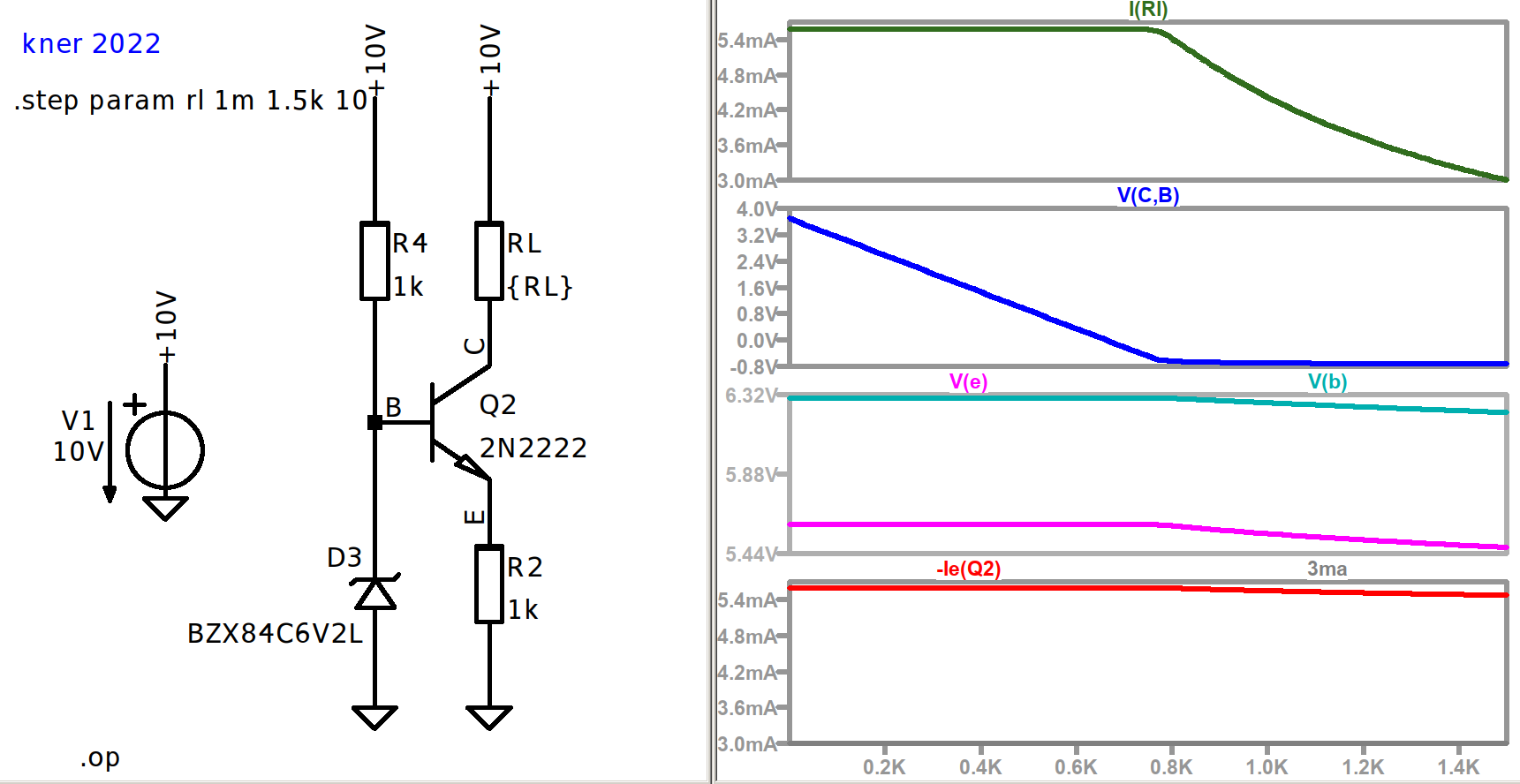 man sieht: wenn der Lastwiderstand den Wert von ca. 700 Ohm übersteigt, wird der Spannungsabfall am Lastwiderstand so hoch, dass die Uce (V(C,B)) negativ wird und dadurch der Transistor in Sättigung geht. Der konstante Strom kann nicht aufrecht erhalten werden.