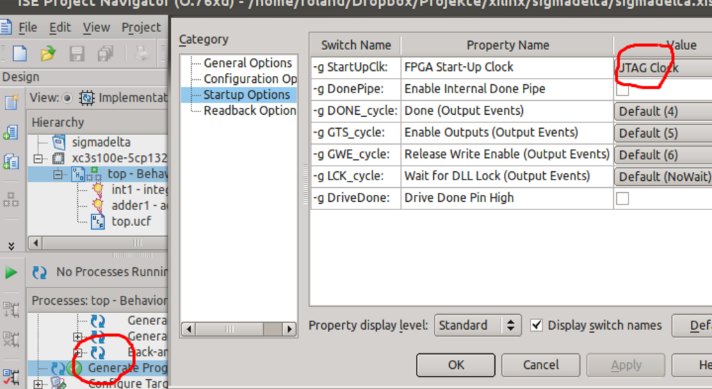 ACHTUNG! Beim Erzeugen des Bitstromes muss auf JTAG-Clock umgestellt werden!