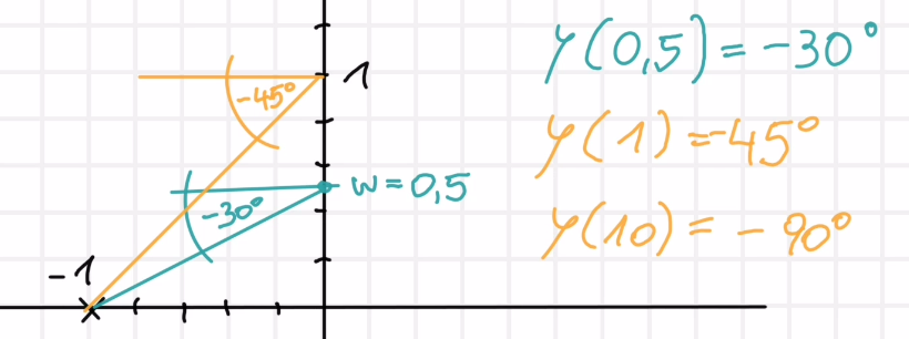 Die Phase ist bei Gleichspannung am Anfang 0, bei sehr hohen Frequenzen -180°; der Pol bei den negativen Frequenzen liefert konstant ca. -90°, der Pol auf der reellen Achse dreht von 0 bis w=1 um ca.