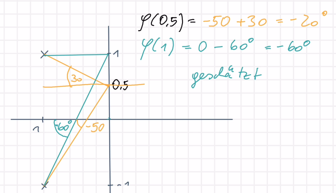man bewegt sich vom Ursprung in Richtung positiver y-Achse und ermittelt den Winkel zu den Polen und Nullstellen. Nullstellen stehen im Zähler des Polynoms: drehen sie die Phase in positive Richtung (gegen den Uhrzeigersinn), so wird der Winkel positiv gezählt; Pole stehen im Nenner, daher werden hier in diesem Fall die Winkel negativ gezählt