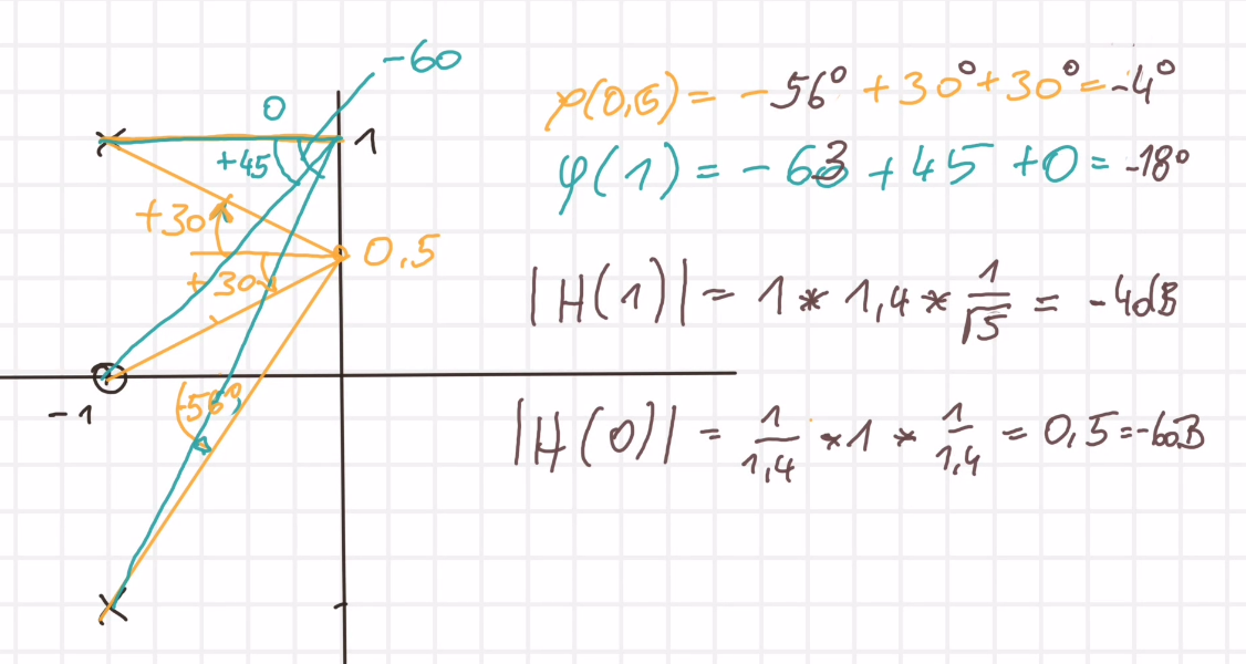 Konjugiert komplexe Pole mit reeller Nullstelle: bei w=1 ist der Abstand zum Pol 1, zum zweiten Pol sqrt(5)=2.3 und zur Nullstelle 1.4; die Gesamt-Verstärkung ist also ca. 1.4*(1/2.3) = -4dB., hier entsteht ein Maximum, in weitem Abstand (hohe Frequenz) ist die Verstärkung 0; Abfall 20db/Dekade (Die Nullstelle neutralisiert eine Polstelle).