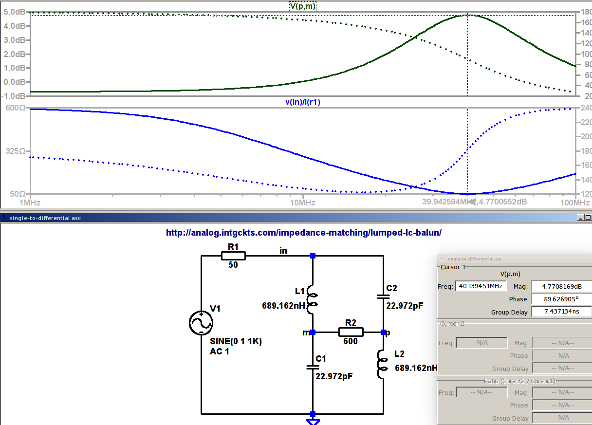 man sieht: bei 40 MHz beträgt der Eingangswiderstand in die Schaltung 50 Ohm, die Quelle V1 ist also angepasst. Die Spannung am Lastwiderstand R2 erreicht ein Maximum.